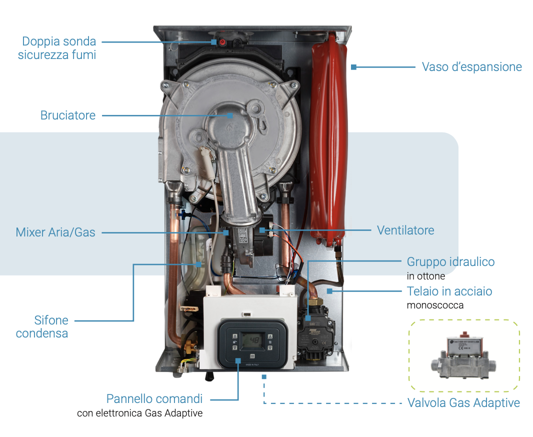 L’adozione della tecnologia adattiva fa sì che la caldaia regoli autonomamente i consumi e la tipologia di gas utilizzato.