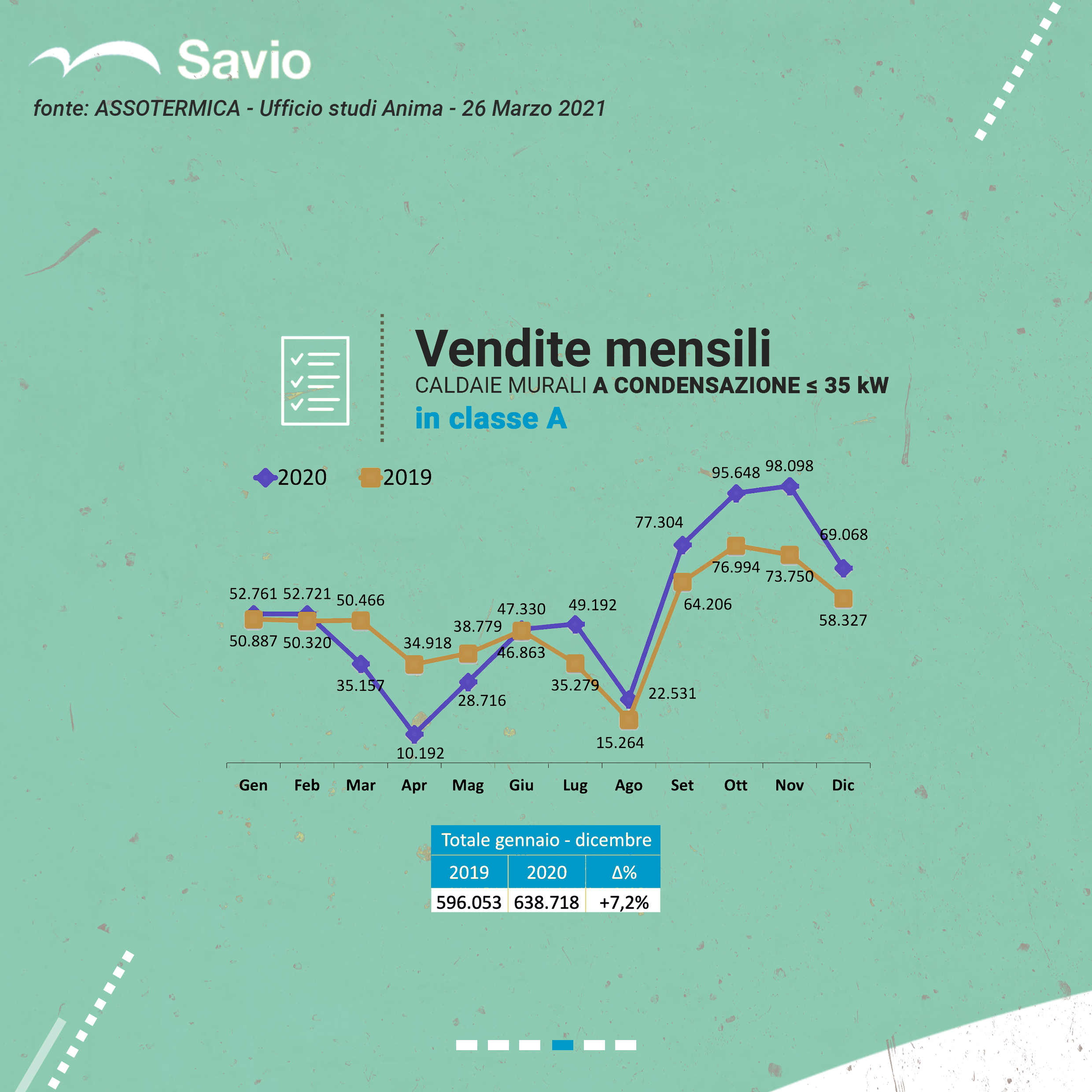 • Da settembre a novembre volumi molti alti che consentono il recupero (+42.665 unità a fine anno di caldaie murali a condensazione ≤ 35 kW in classe A, rispetto al 2019).