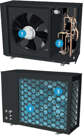 In mancanza di carico freddo e su chiamata della sonda di funzionamento sanitario, l’unità provvede al riscaldamento dell’acqua all’interno del serbatoio di accumulo per il sanitario, utilizzando la batteria a pacco alettato come evaporatore. L’utilizzo dell’aria calda esterna come sorgente di calore garantisce l’ottenimento di COP estremamente elevati.